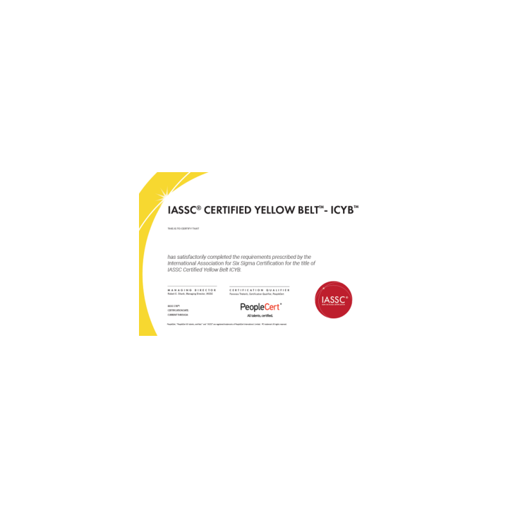 Upon successful achievement, Professionals will receive IASSC Yellow Belt Certification issued by the International Association for Six Sigma Certification™, a true independent third-party Certification Association within the Lean Six Sigma Industry.